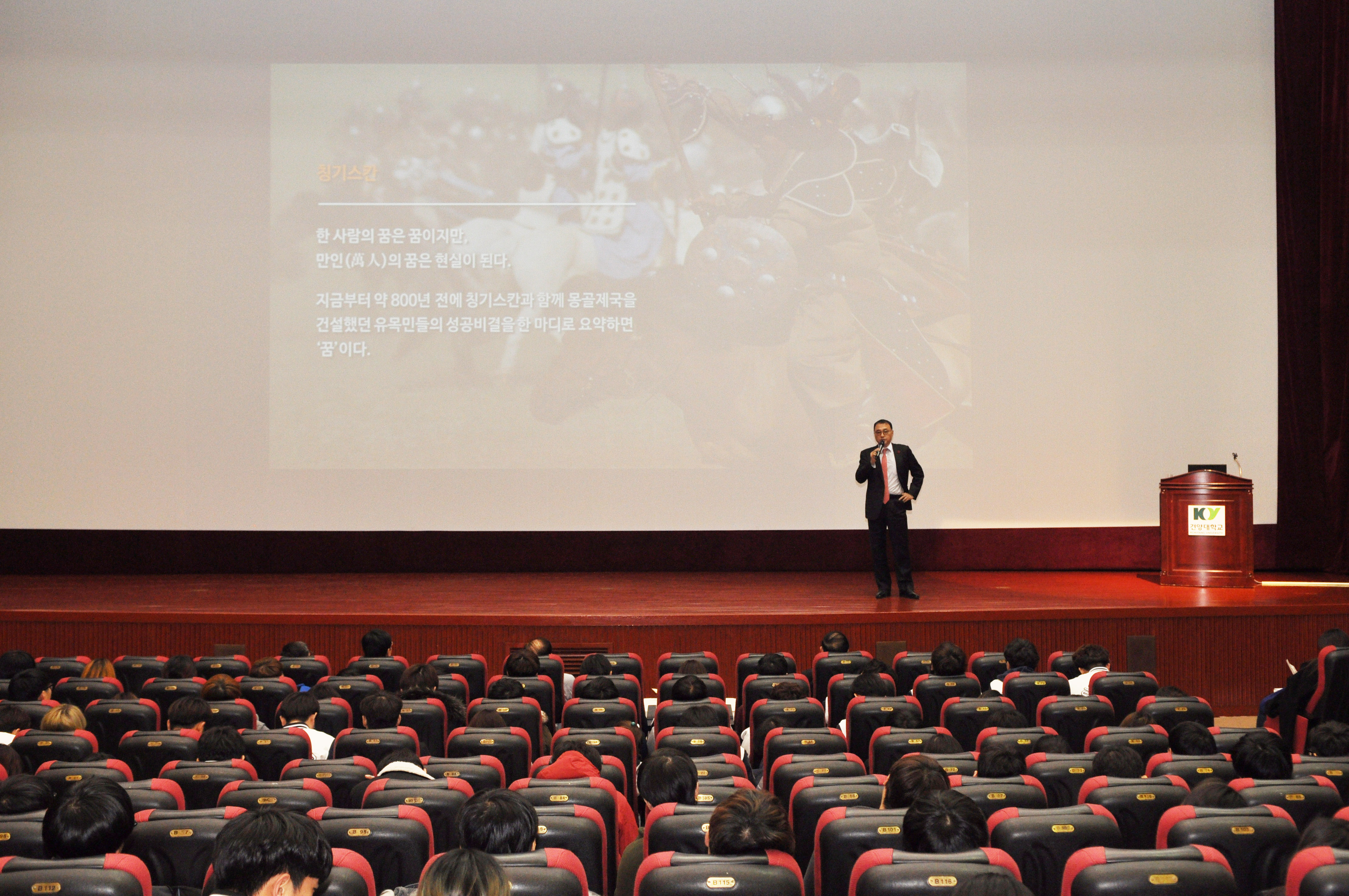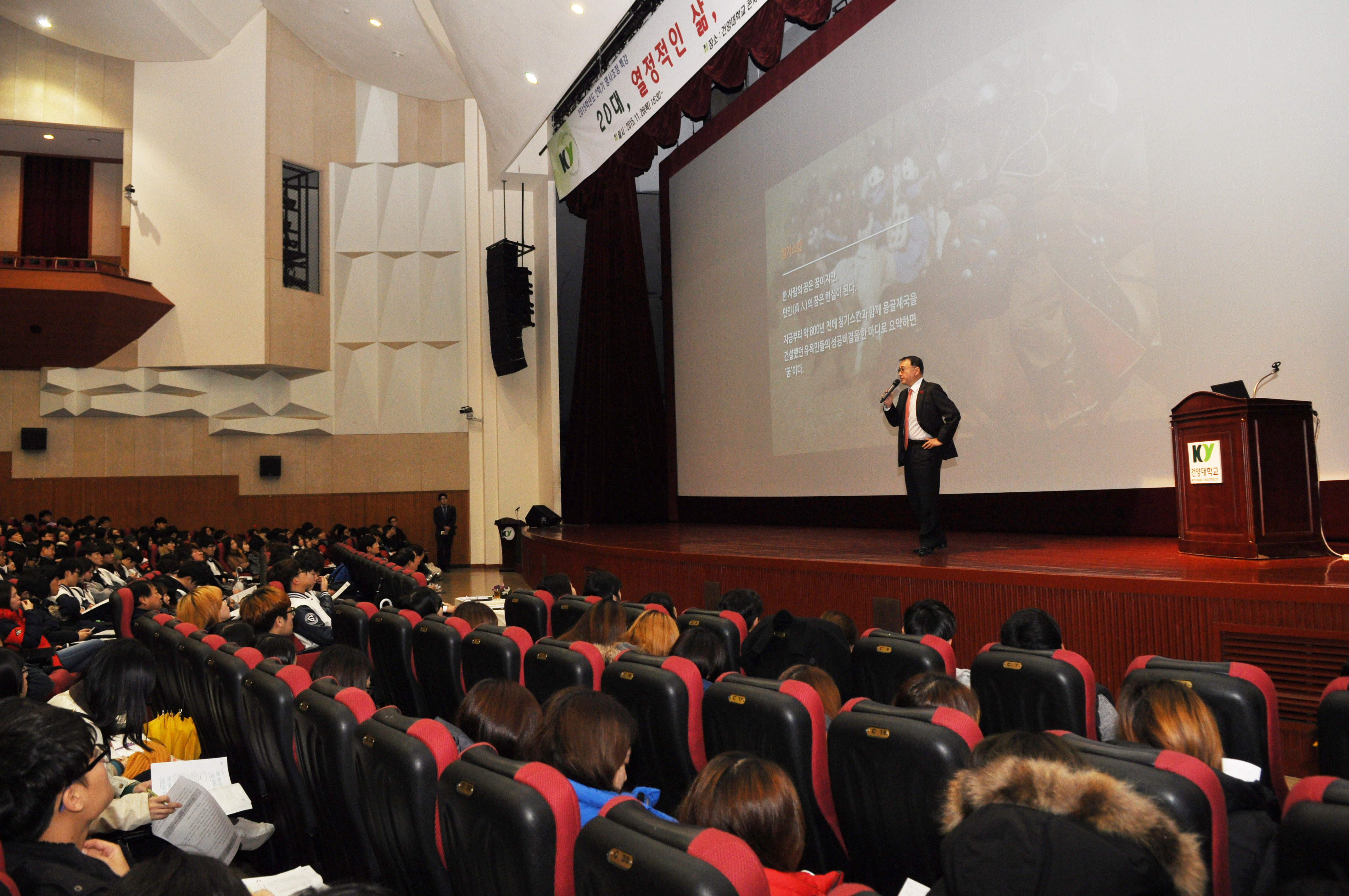 세방그룹 이상웅 회장, 건양대 특강 건양대학교(총장 김희수)가 26일 오후 논산창의융합캠퍼스 콘서트홀에서 세방그룹 이상웅 회장을 초청해 ‘20대, 열정적인 삶, 그리고 인생의 성공!’이라는 주제로 특강을 진행했다. 파트너십트레이닝(PT) 명사초청특강의 일환으로 진행된 이번 특강에 학생과 교수 900여명이 참석했다. 이 회장은 ‘열정적이며 성실한 삶의 태도가 인생을 풍요롭게 만든다’며 열정을 가지고 성공한 리더들의 이야기와 명언들을 인용하며 열정은 명확한 꿈과 비전을 가졌을 때 나온다고 강조했다. 또한, 회사를 경영하면서 겪었던 경험을 바탕으로 학생들에게 리더로 살기위해 필요한 것에 대해 생각을 밝혔다. 자신이 가장 잘하는 일에 선택과 집중을 해야하며 자신이 옳다고 생각되는 일에는 손해를 보더라도 추진할 수 있는 과감한 결단력이 필요하다고 이 회장은 말했다. 이번 특강을 준비한 건양대 글로벌경영학과 박태진교수는 “앞으로도 성공한 CEO와 학생들의 만남을 계속적으로 추진해 기업현장의 노하우를 학생들이 체득할 수 있도록 하겠다”고 밝혔다.