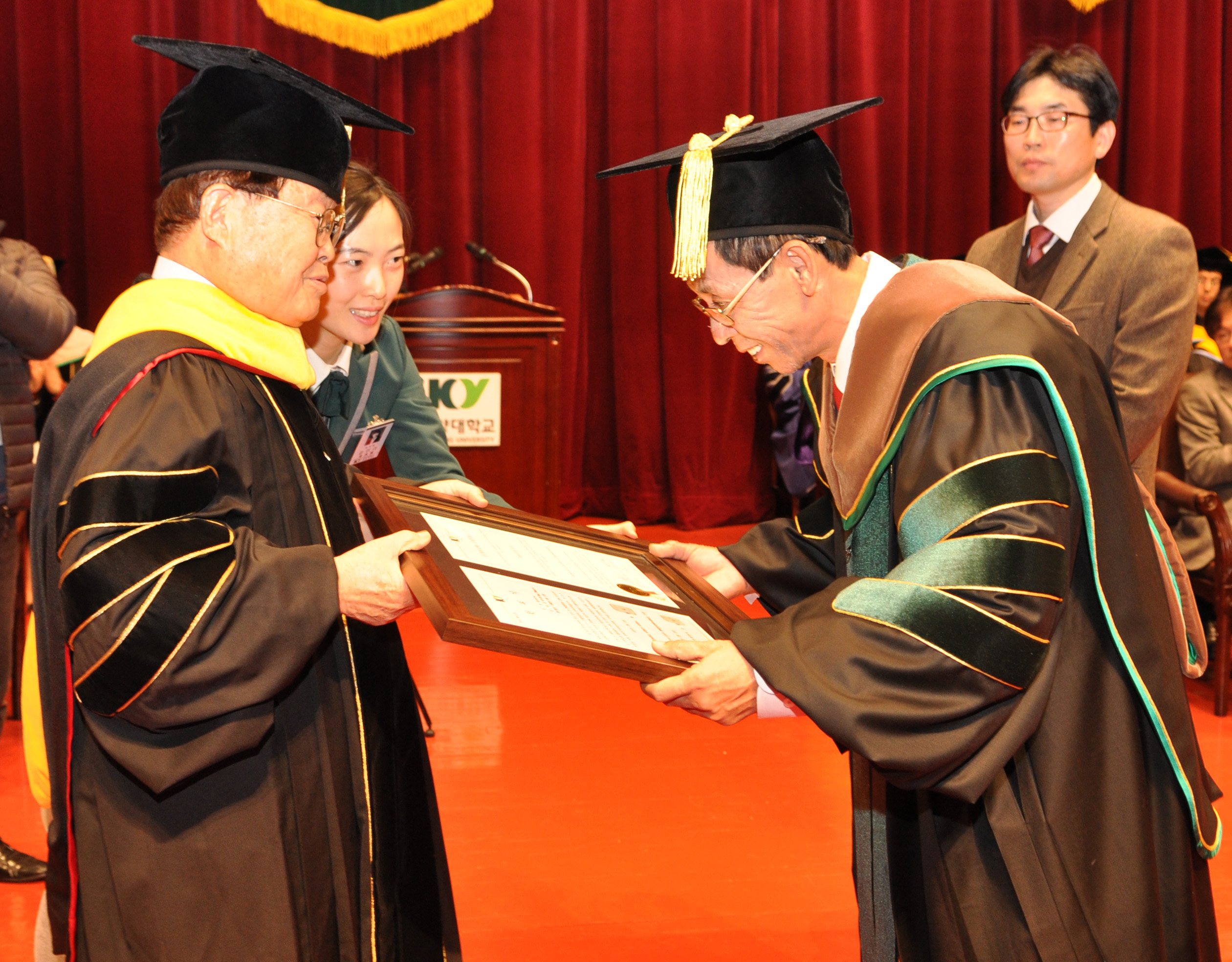 건양대 김희수 총장이 NPIC 총장에게 명예박사학위증을 건네고 있다.jpg