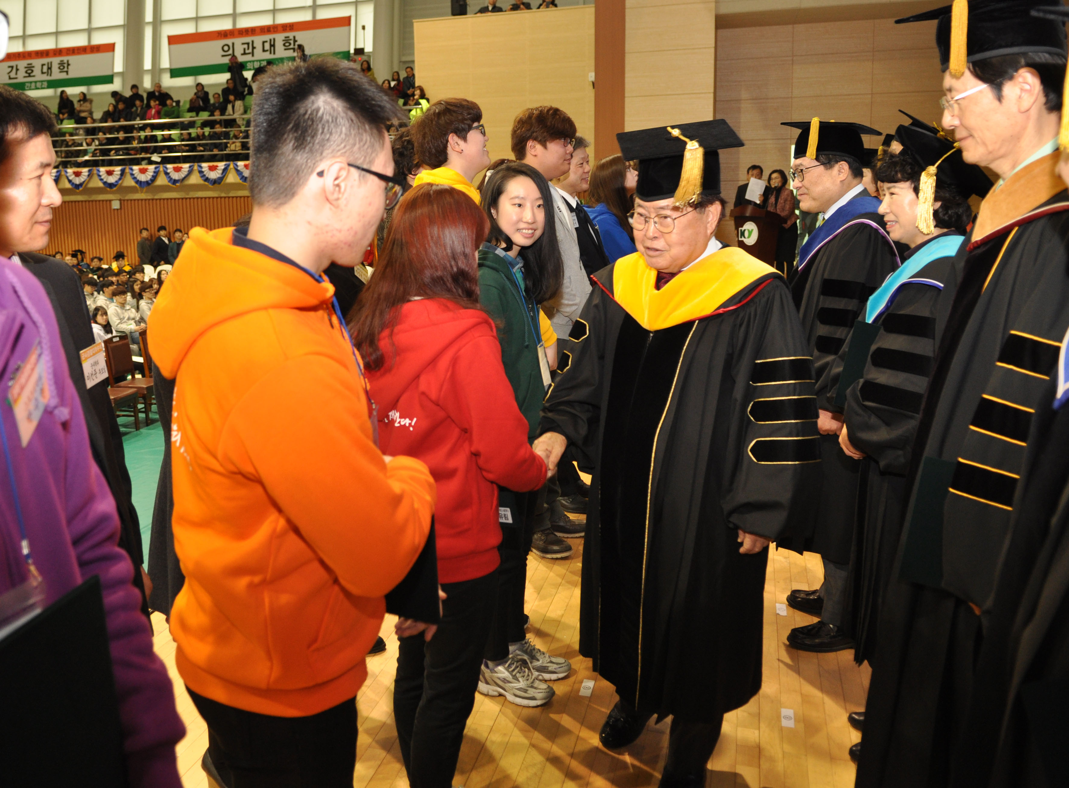 김희수 총장이 신입생들의 입학을 축하해 주고 있다.jpg