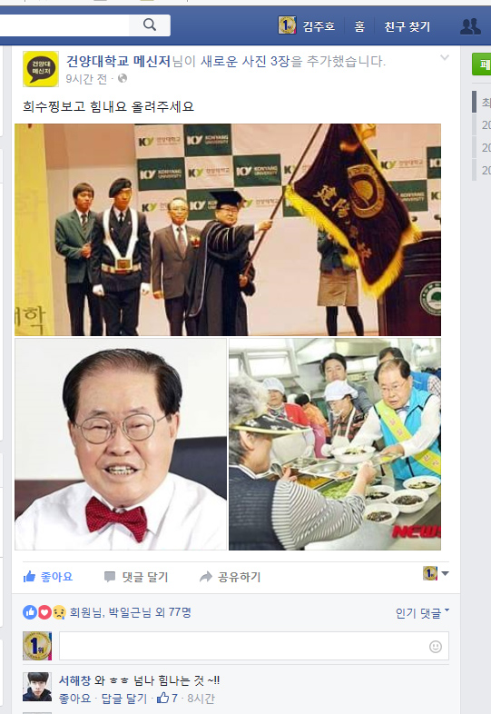 모두가 잠들어있는 새벽 4시. 중간고사를 맞아 도서관에서 밤새워 공부하는 학생들은 이 시간 즈음 기대하는 게 있다. 가장 출출해질 이 시간에 신선한 빵과 우유를 사들고 도서관에 찾아오는 김희수 총장(89)이다. 건양대학교의 설립자이자 현직 최고령 총장인 김희수 총장은 2001년부터 지금까지 16년째 중간고사와 기말고사 등 시험이 있을 때마다 새벽에 도서관을 찾아 학생들에게 빵과 우유를 나눠주고 있다. 이제는 대학의 전통처럼 되어 학생들이 시험을 볼 때 은근히 기다리게 되는 연례행사가 됐다. 이 같은 시험기간 새벽에 빵을 나눠주는 행사는 평소 학생사랑이 극진하기로 소문난 김희수 총장이 2001년 새벽에 도서관을 순시하다가 밤새 공부하며 배고파 하는 학생들을 보고 즉석에서 빵을 사다가 나눠준 것에서부터 시작됐다. 뿐만 아니라 김 총장은 틈만 나면 학교를 돌아보며 학생들이 수업하는데, 생활하는데 불편함이 없는지 살펴본다. 학생들이 학교에서 문화와 재미를 즐길 수 있도록 생회관에는 학생들이 즐길 수 있는 당구장, 탁구장, 게임기, 노래방 시설들도 갖춰놓았고 지난해에는 교내에 거액을 들여 6개 레인을 갖춘 볼링장을 열었다. 그 덕분에 김 총장은 별명이 많다. 손수 담배꽁초를 줍고 다녀서 ‘꽁초줍는 총장’, 시험때마다 빵을 나눠주서 ‘빵총장’, 고령에도 불구하고 젊은 세대들과 소통하기 때문에 ‘총장오빠’라고 불리기도 한다. 최근에는 또 하나의 별명이 생겼다. 최근 신세대들이 대단하다는 뜻으로 본래 영어 단어로 ‘신(神)’을 뜻하는 ‘갓(God)’울 특정 단어나 인물 앞에 붙이는 신조어를 활용한 ‘갓희수’다. 건양대 관련 각종 정보가 올라오는 한 페이스북 페이지에는 ‘오늘도 갓희수 보고 힘낸다’라는 댓글이 달려있다. 건양대에 재학 중인 황정하씨(의료뷰티학과 3학년)는 “김희수 총장님이 학생들과 간담회를 할 때 항상 강조하는 말이 있다. “포기란 것은 배추를 셀 때나 쓰는 말이다. 여러분들은 절대 포기하지 말고 끝까지 최선을 다해달라”는 것이다. 건양대는 수업과 과제가 빡빡하기로 소문나있지만 총장님의 열정과 진정성을 학생들도 알기 때문에 최선을 다하고 있다“고 말했다.
