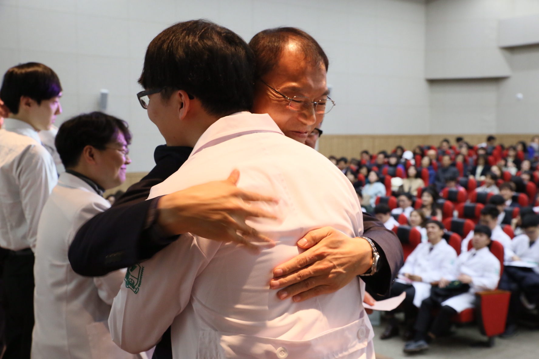 이날 열린 행사에는 5학년으로 올라가며 임상실습을 앞둔 재학생 64명과 학생 가족 150여명, 정연주 건양대 총장과 최용우 의과대학 학장, 의과대학 교수 및 직원 등 대학 관계자 40여명이 참석했다.
