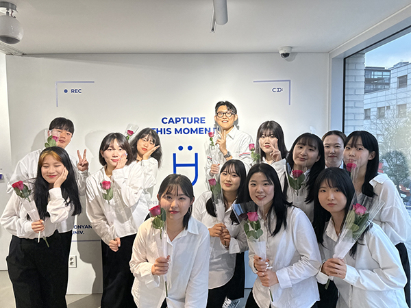 서울 인사동에서 진행되는 2023 졸업작품전시회에 참가한 건양대 융합디자인학과 학생들과 교수들의 기념사진.jpg
