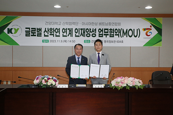 건양대학교(총장 김용하) 산학협력단(단장 홍영기)과 아시아한상 베트남총연합회(회장 김정민)가 9일 오후 건양대 창의융합캠퍼스 명곡정보관에서 글로벌 우수인재양성과 공동관심분야 협력체계 구축을 위한 산학연 업무협약을 체결했다.