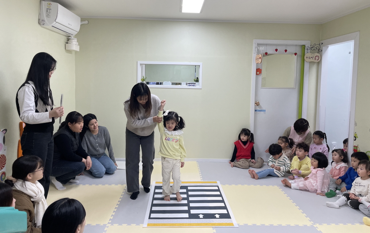 건양대 간호학과 아이조아 학생들이 어린이집 아동들에게 횡단보도 건너는 교육을 하는 모습.jpg
