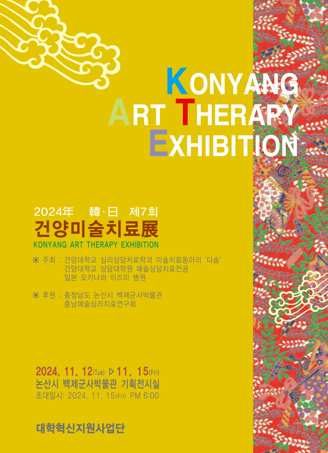건양대 심리상담치료학과, 15일까지 건양 미술치료전 열어 건양대학교(총장 김용하) 심리상담치료학과(학과장 손영미) 및 대학원, 일본 오키나와 이즈미병원이 연합해 진행하는 제7회 건양 미술치료전이 12일부터 15일까지 충남 논산시 백제군사박물관에서 열린다. 건양대 심리상담치료학과 미술치료동아리 다솜은 2004년부터 지역아동 센터, 성지원, 백제병원, 시립노인전문병원 등에서 미술치료 봉사활동을 꾸준히 해오고 있으며 상담대학원 예술상담치료전공 대학원생들과 함께 지역사회 기관에 예술상담 및 치료를 제공하고 있다. 심리상담치료학과는 이러한 미술치료의 의미와 성과를 지역사회 사람들과 공유하고자 매년 미술치료전을 열고 있다. 특히 정신의료, 치매치료, 정신장애자 등 지역의 심신이 불편한 사람을 치료하기 위하여 예술치료를 오랫동안 실시해 온 일본 이즈미병원과 2014년 협약을 맺고 병원방문을 통한 실습체험과 문화교류 활동을 정기적으로 진행해 오고 있다. 건양대 심리상담치료학과 박완용 교수(미술치료동아리 지도교수)는 “본 전시회를 통해 지역민의 정신건강을 증진시키기 위해 지속해온 예술치료적 개입을 지역사회에 알릴 수 있기를 기대하며, 앞으로도 해외 기관과의 교류를 확대해 학생들이 미술치료의 다양한 방식과 효과를 접할 수 있도록 할 것”이라고 밝혔다.