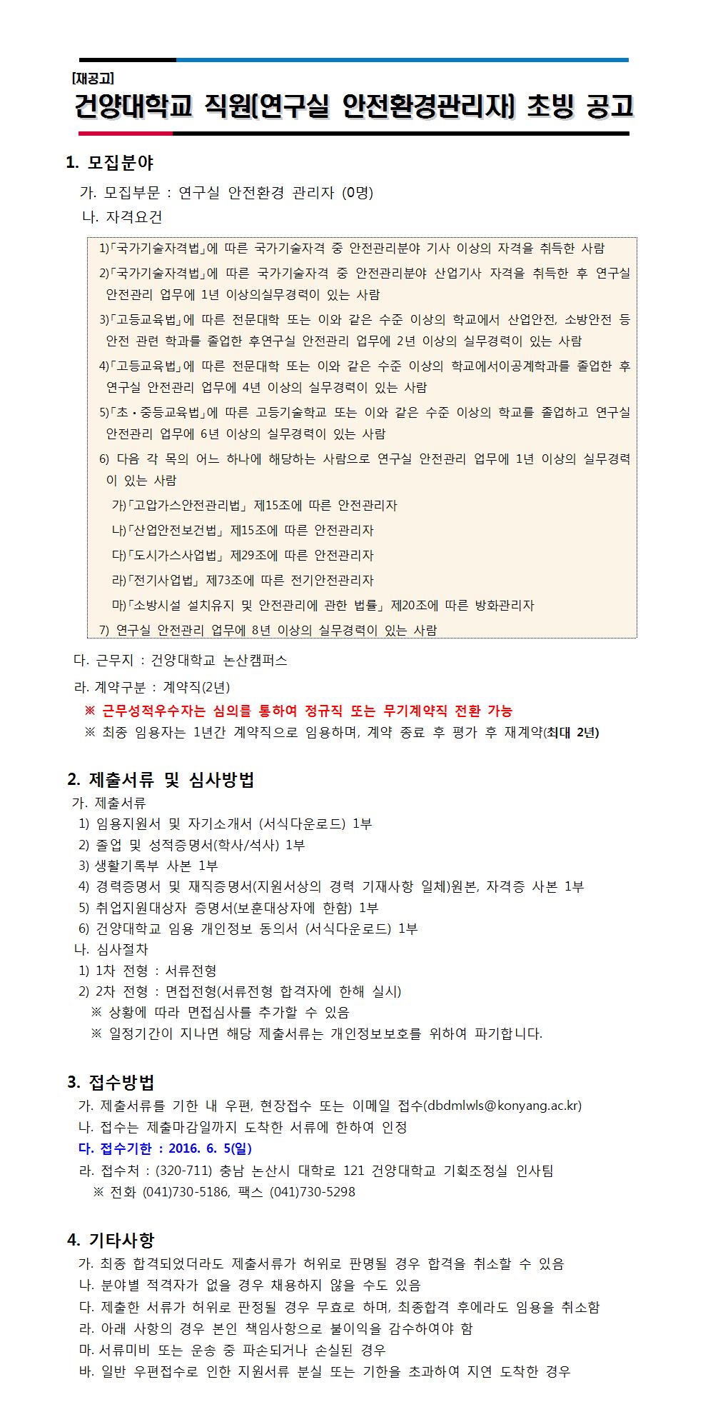 | 제목 | 건양대학교(연구실 안전환경관리자) 초빙 재공고 (~6.5) | ||||
