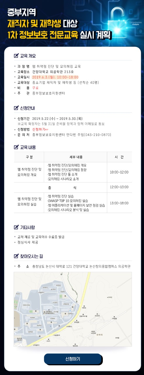 『 중부정보보호지원센터 주관 정보보호 교육 안내 』글의 상세내용을 확인하는 표로 제목, 부서명, 등록일, 조회, 첨부, 내용으로 나뉘어 설명합니다.