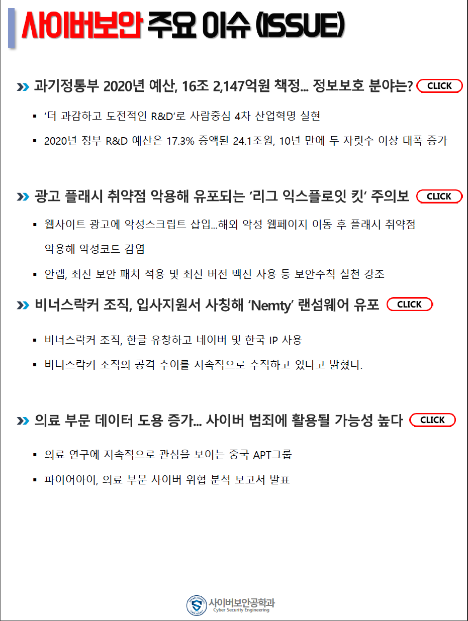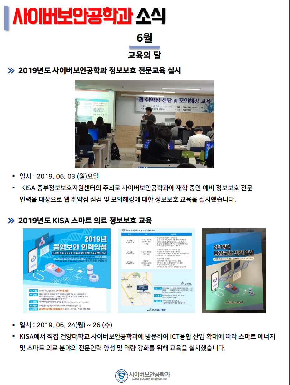 『 사이버보안공학과 보안매거진 2019-3호 』글의 상세내용을 확인하는 표로 제목, 부서명, 등록일, 조회, 첨부, 내용으로 나뉘어 설명합니다.
