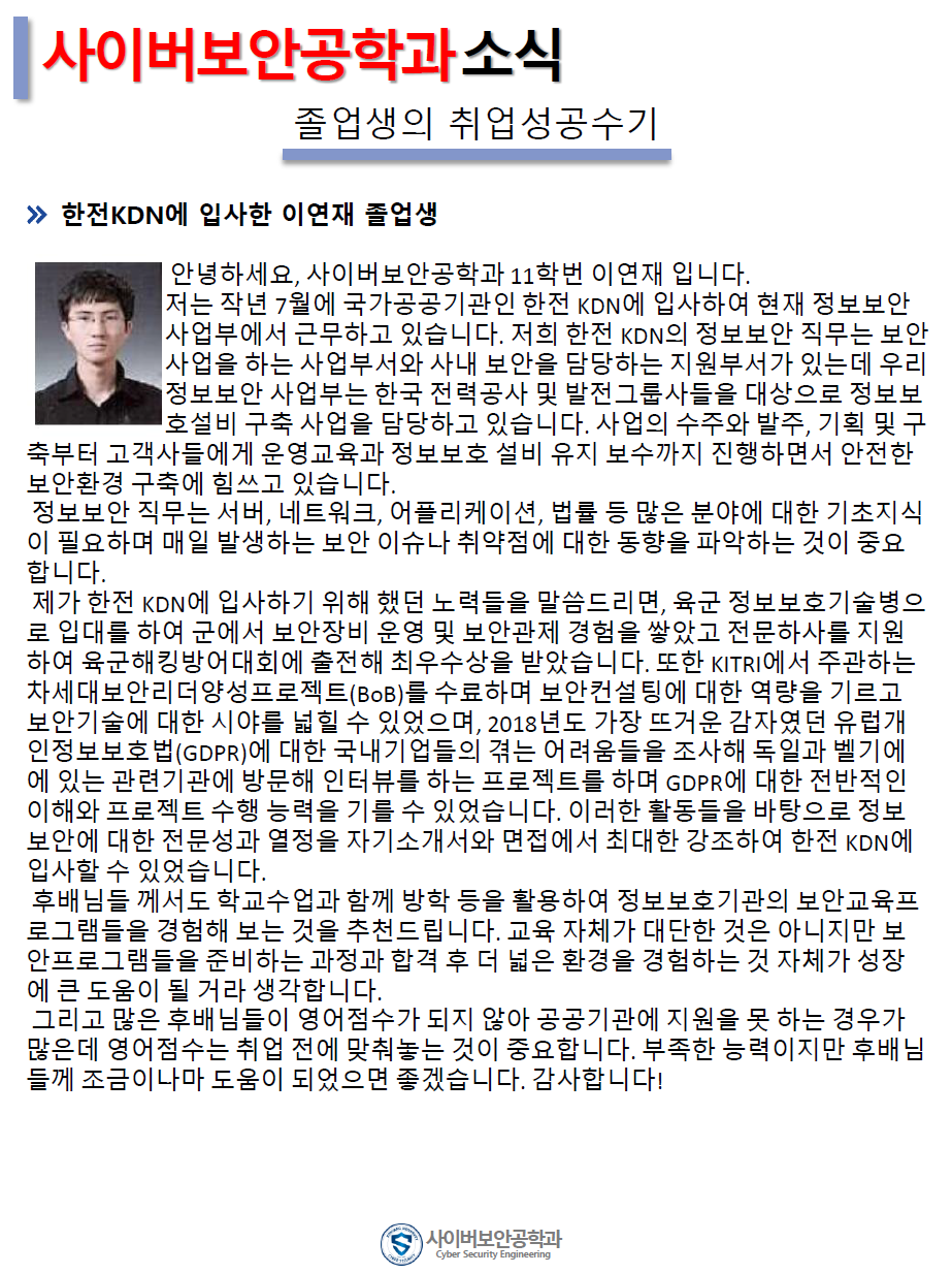 『 사이버보안공학과 보안매거진 2020-1호 』글의 상세내용을 확인하는 표로 제목, 부서명, 등록일, 조회, 첨부, 내용으로 나뉘어 설명합니다.