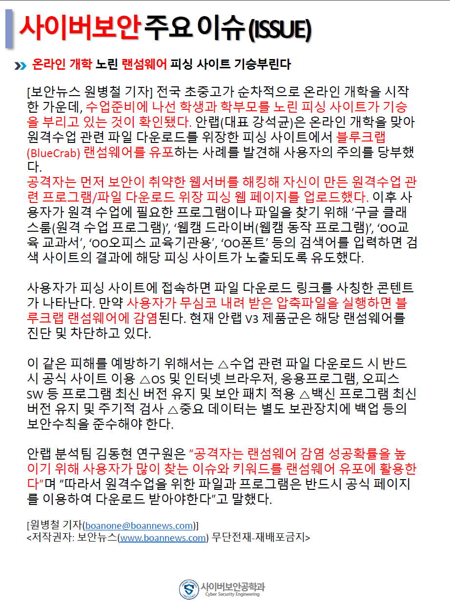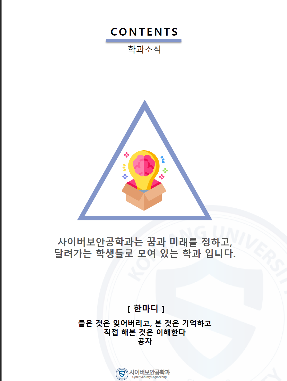 『 사이버보안공학과 보안매거진 2020-2호 』글의 상세내용을 확인하는 표로 제목, 부서명, 등록일, 조회, 첨부, 내용으로 나뉘어 설명합니다.