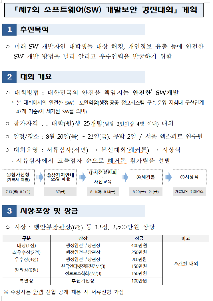 『 제7회 소프트웨어(SW) 개발보안 경진대회 』글의 상세내용을 확인하는 표로 제목, 부서명, 등록일, 조회, 첨부, 내용으로 나뉘어 설명합니다.